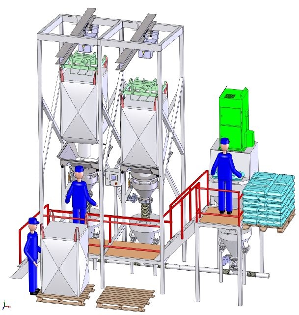 噸袋卸料站是用來實現袋裝散料的卸料功能,為半自動設備,其工作原理及操作流程為: 1、其工作原理如下:拆包站由框架、拆包料斗、電動葫蘆、除塵器、旋轉送料閥(根據后面工序要求設置此閥門)等組成。 2、電動葫...